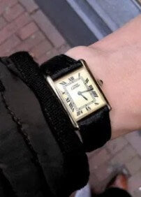 Another company that has clearly taken inspiration from Cartier is American watchmaker, Bulova. Their Classic Collection includes a rectangular watch with a crocodile leather band (check its price on Amazon), which doesn’t completely borrow its look from the Tank, but the resemblance is pretty obvious. The black and silver watch dispenses with the railroad tracks, but it still uses Roman numerals.