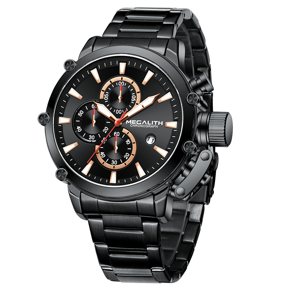 Megalith 8262m men watches with stainless steel strap, cool look of the round case& sub-dial and the puristic and clear line of the quartz chronograph watch designed complement each other ideally and guarantee a glittering appearance.